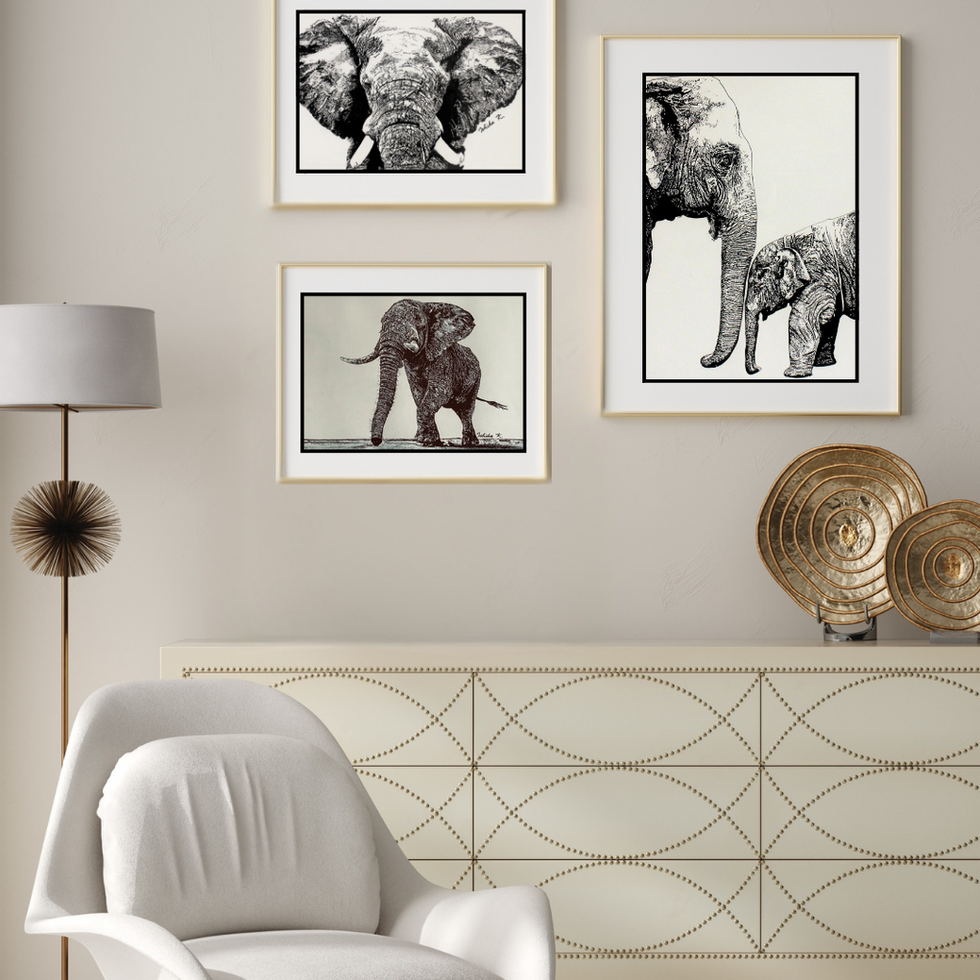 This artwork is meticulously crafted using the pen and ink technique, a medium that demands exceptional skill and attention to detail. Every line and stroke has been carefully placed to replicate the intricate folds and textures of the elephant's skin, making the piece remarkably lifelike. The monochrome palette enhances the emotional intensity and depth, emphasizing the sheer artistry behind this rare and timeless creation.